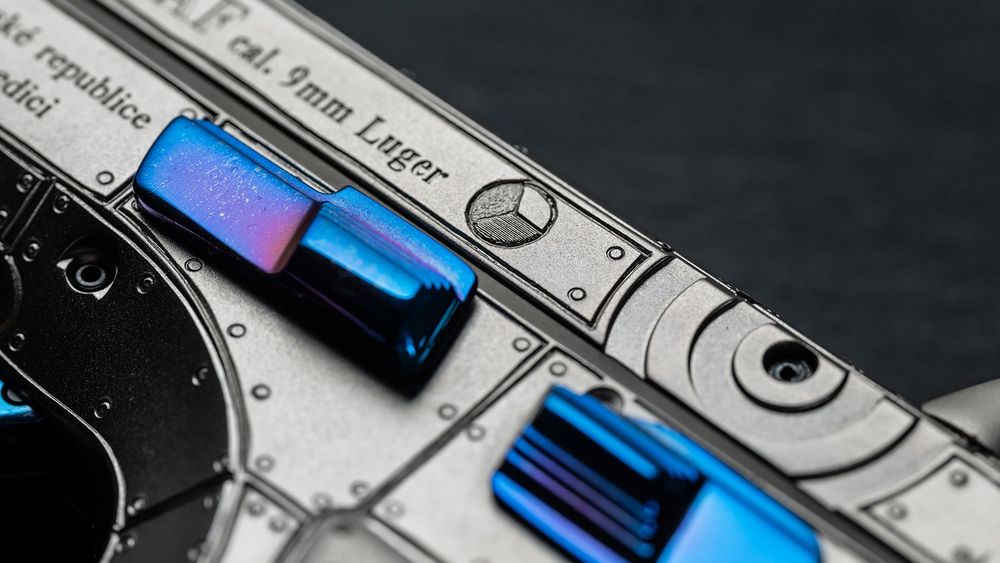 3. Tanúsítás és művészet: A gyűjtői darabot hitelesíti az oklevél, valamint a híres cseh művész, David Černý kézjegyével ellátott doboz. A csomagolás egy, a brit csata témájájú, Jaroslav Velc által kézzel festett és aláírt illusztrációval is gazdagodik. Minden pisztolyhoz tartozik a hozzá tartozó RAF-század jelvényével hímezett kitűző is.