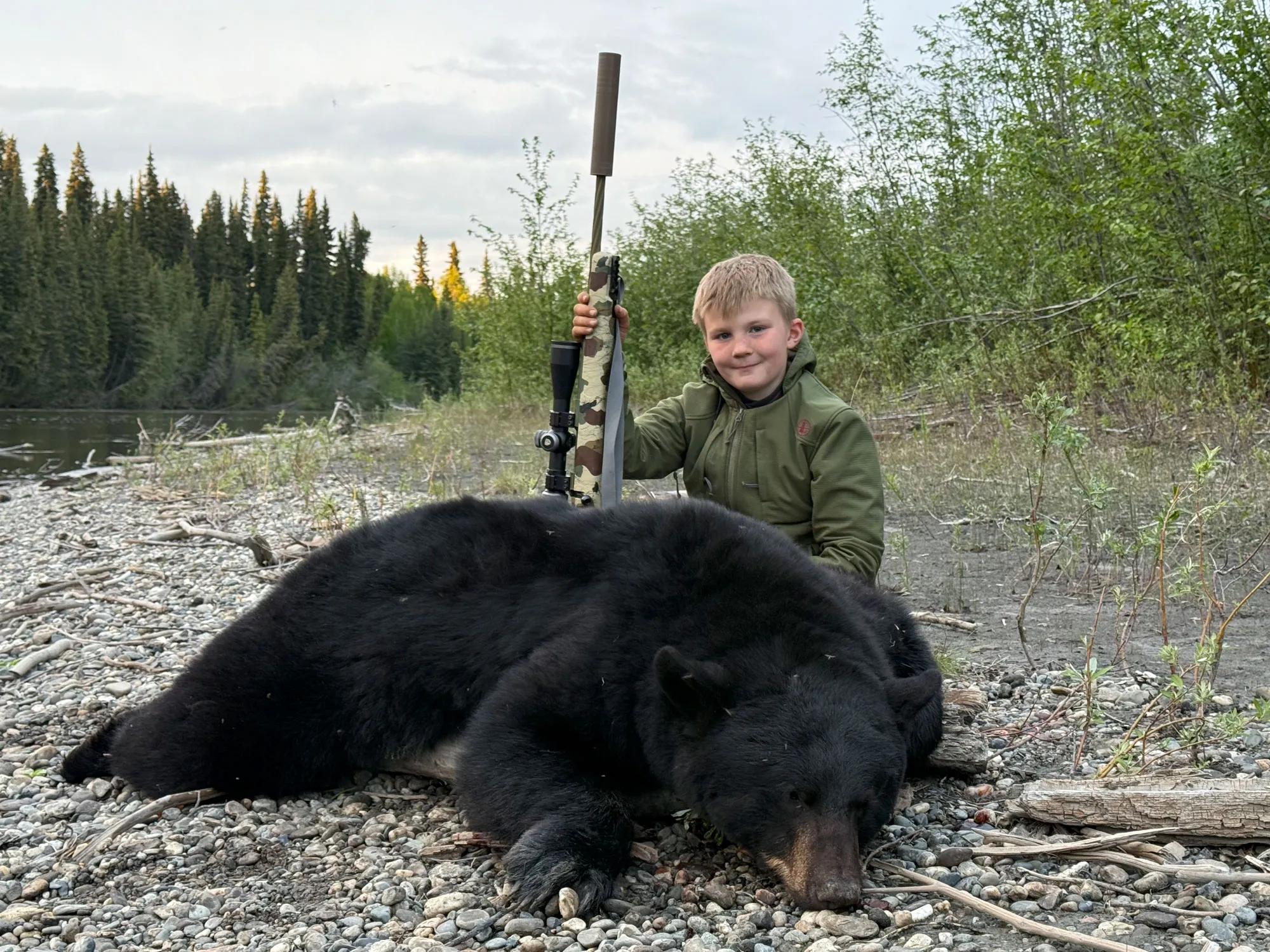 A szerző fia egy szép fekete medvével, amelyet az UM egyedi Tikka T3x 6mm CM puskával ölt meg. –