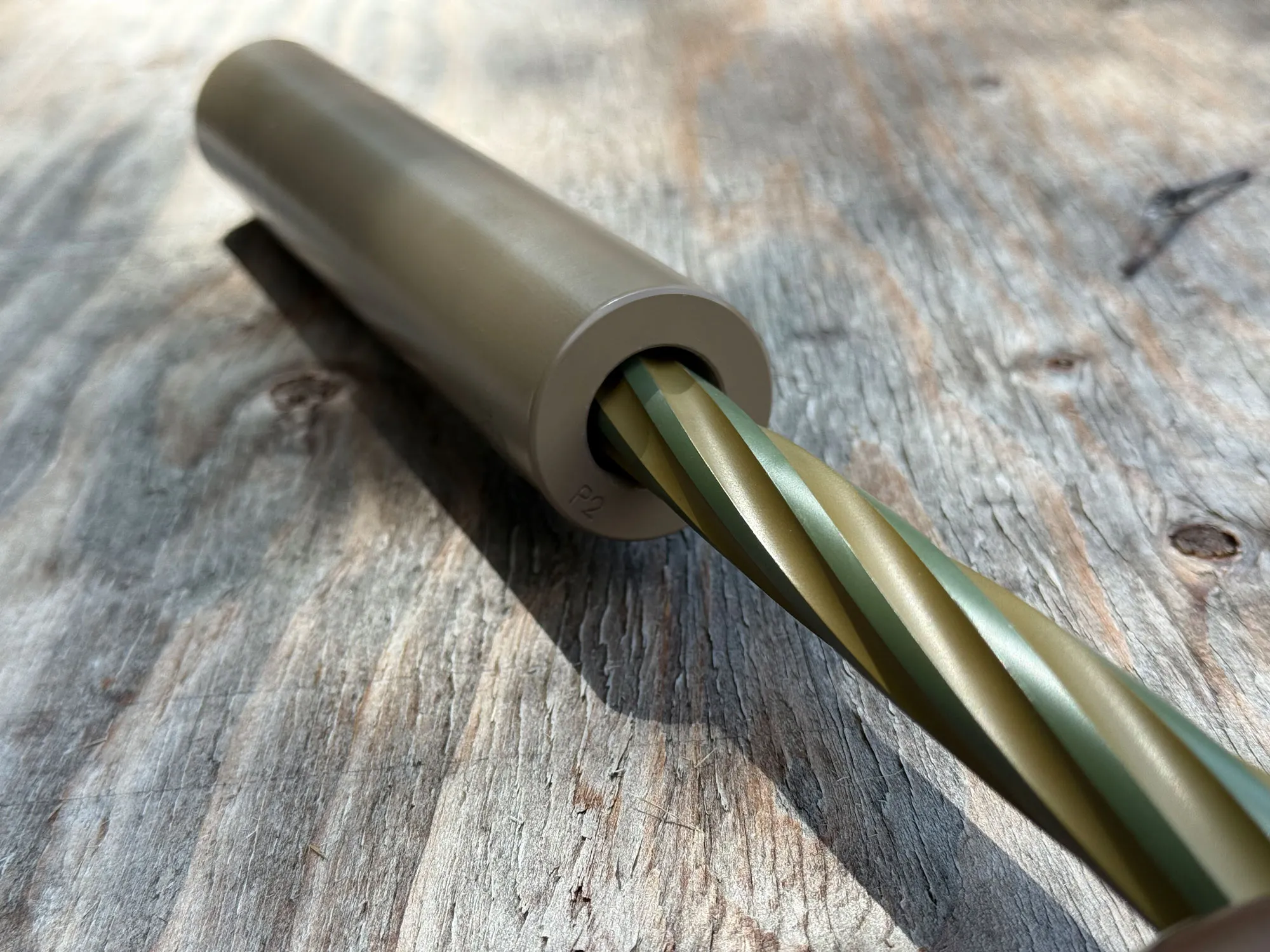 A puskaépítéssel együtt az Unknown Munitions nemrégiben kiadta az OG-t is, az elsőt a 3D-nyomtatott titán vadászati hangtompítók sorában. Ez egy monolitikus, egy darabból álló hangtompító, amely nagy reflexkamrával rendelkezik – amelyet általában robbanókamrának neveznek, és csak négy hüvelykkel nyúlik túl a torkolaton. A reflexkamra visszanyúlik a cső fölé, és tágulási teret biztosít a torkolati gázok számára, miközben a puska teljes hossza rövidebb marad – ez az egyik legfontosabb szempont a hangtompítókat használó vadászok számára.