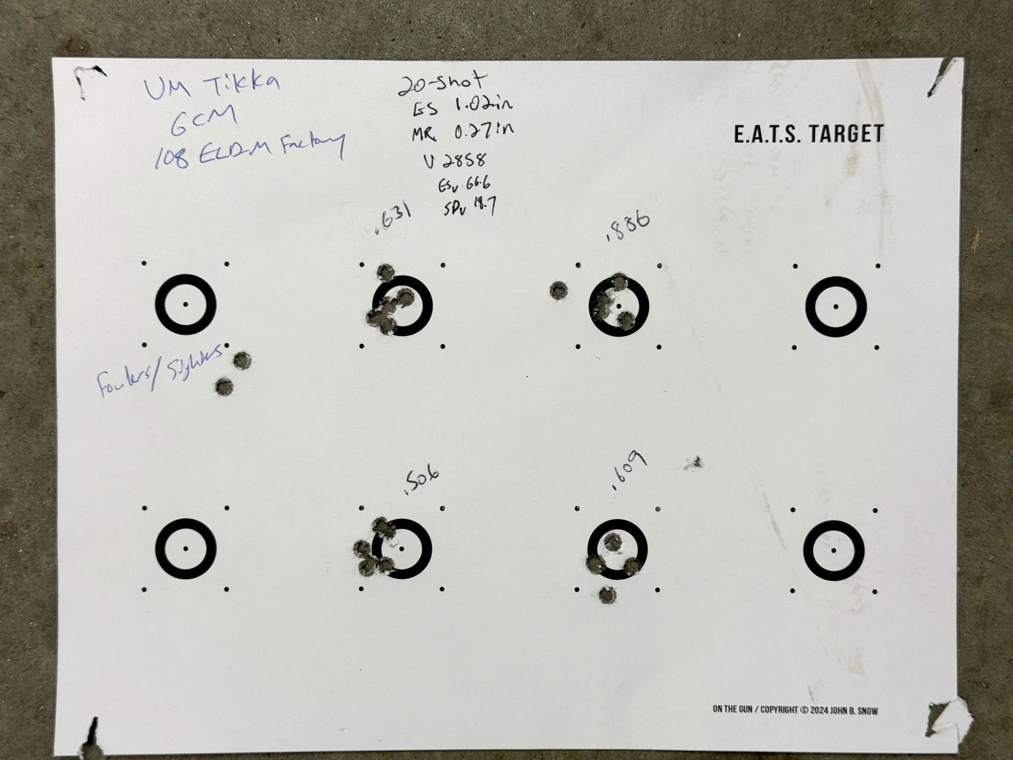 Az én testreszabott Unknown Munitions – vagy röviden UM – Tikka 6mm Creedmoor kaliberű, és elsősorban kézzel akarok tölteni hozzá lőszert. Két különböző gyári kínálattal teszteltem, és ez jelentősen pontosabb, mint az általam értékelt gyári vadász Tikkák. Az alább felsorolt eredményeken kívül betöltöttem a Hornady 103 graines ELD-X golyókat és a Tubbs 115 graines DTAC-jét noseringgel, és mindkét töltet 20 lövéses csoportösszesítést eredményezett körülbelül 1,25 hüvelykkel és középső 0,3 hüvelyk közepes sugarakkal.