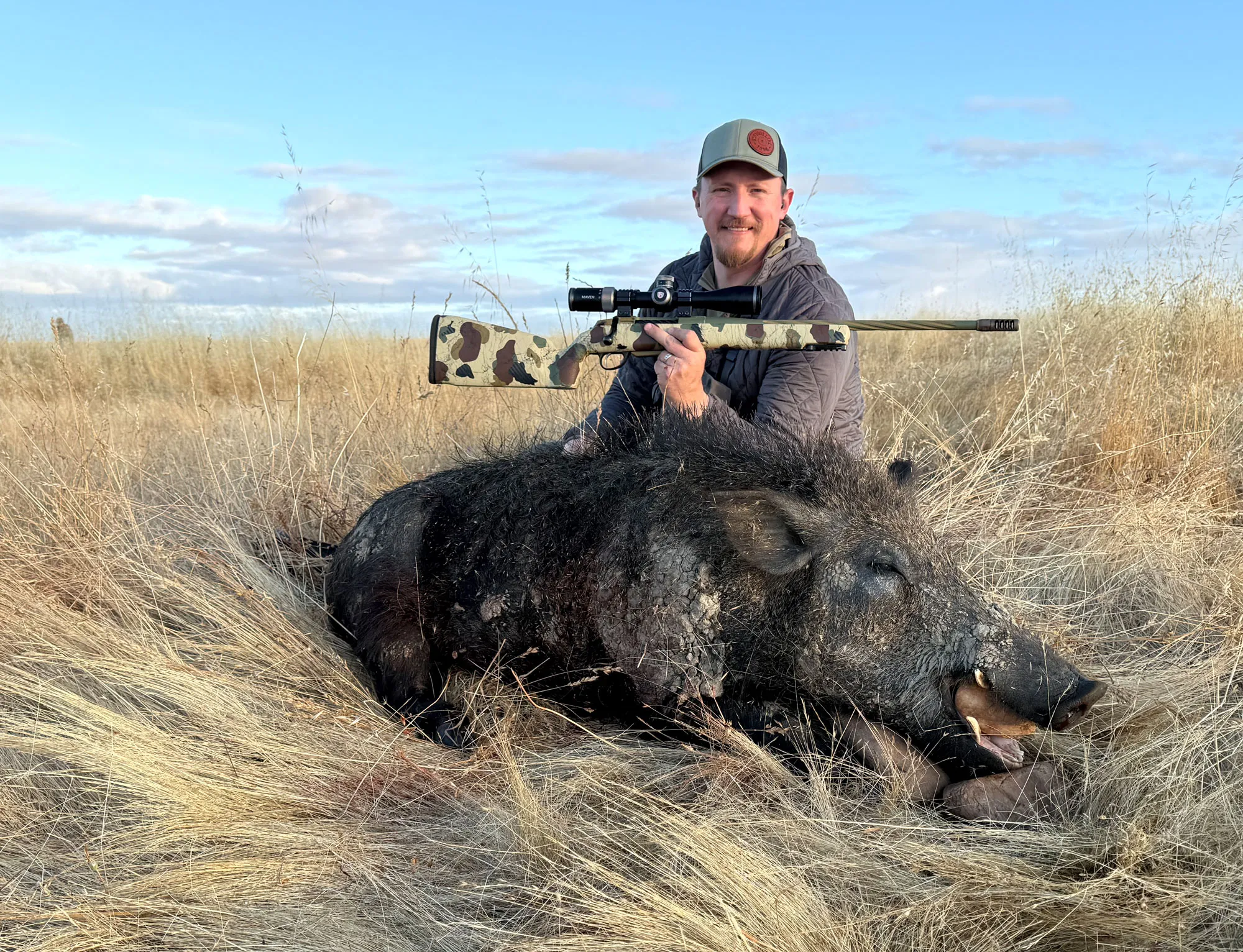 A szerző egy nagytestű kaliforniai vaddisznóval, amelyet egy zsákos állványról állva lőtt. –