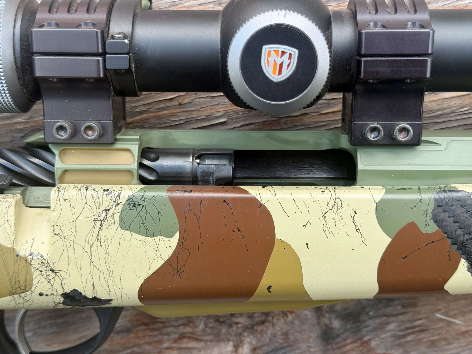Az elsütőszerkezet gyári, de van egy frissített elsütőbillentyű rugó, amely csökkenti a húzási súlyt egy font, kilenc unciára a puskámon. Ez ropogós és csodálatos, és minden csavar és rögzítőelem menetbiztosítása festéktollal történt. Az zárszerkezet tetején egy sor Unknown Munitions saját fejlesztésű Tikka távcsőgyűrű található. A Tikkák még mindig rendelkeznek egy furcsa fecskefarok optikai rögzítési rendszerrel, és ezek a gyűrűk úgy készültek, hogy ráfeszülnek erre, és a lineáris mozgástól olyan oszlopok biztosítják, amelyek a zárszerkezet tetején lévő lyukakba illeszkednek. Ezek nagy teherbírású, tartós gyűrűk, és kiküszöbölik a további sínek szükségességét a zárszerkezeten.
