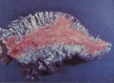 Szabályos növekedésű barkás agancs keresztmetszete. A külső szélén jól kitűnnek a vérerek, amelyek a gyöngysorok árkaiban haladnak. A külső kéreg és a belső szivacsos állomány is jól elkülöníthető.
