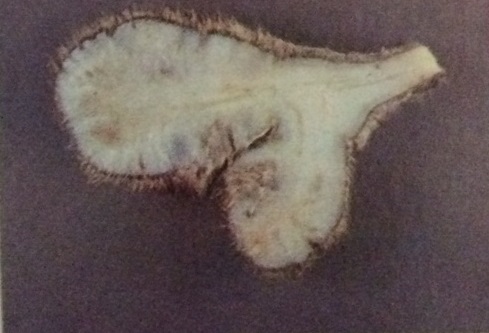 Parókás agancs daganatszerű kötőszöveti növedékének hosszmetszete. Az elkeskenyedő „nyélben” összenyomott vérér.