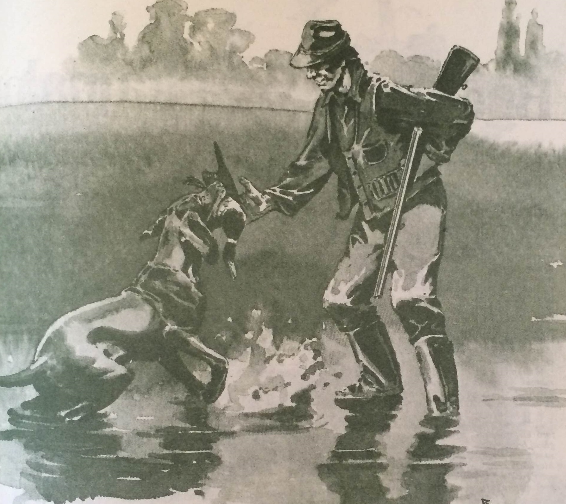 Alig halt el az újabb lövés döreje, Káró nem bírta tovább a tétlen várakozást, és gázolva, úszva igyekezett gazdája felé. Feri közben a másik lábával is combig merült a vízbe, és csak a kezével mutatta az irányt a kutyának, amely rövid keresés után fújtatva hozta az első és valamivel később a második kacsát is. Az elsőnek lőtt madár szárnyai törötten csüngtek alá, véres fejtollai azt mutatták, hogy oda is kapott néhány sörétszemet. A második azonban olyan volt, mintha csak aludna. Minden tolla a helyén, egyetlen vércsepp sem látszott rajta.
